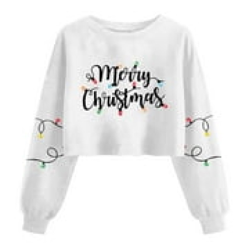 Guzom Womens White Christmas Crop Top Sweatshirt - Merry Christmas Light Print, Long Sleeve Crew Neck, 100% Polyester, S-XL,Size S